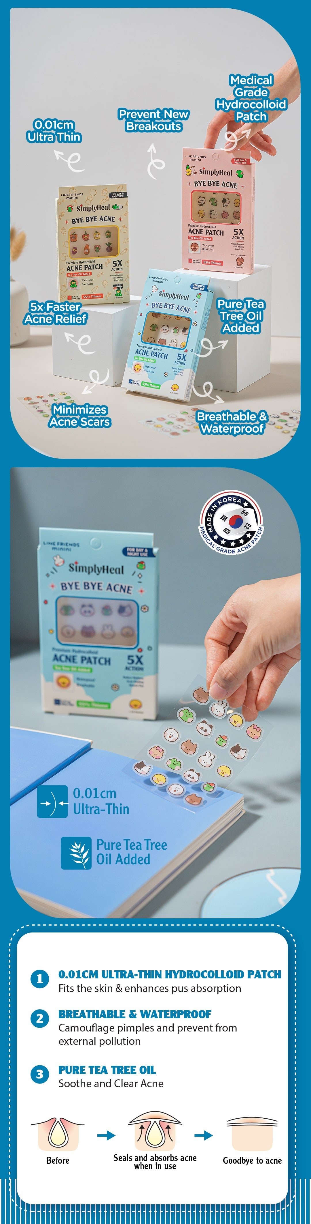 SimplyHeal LINE FRIENDS minini Day & Night Premium Hydrocolloid Acne Patch 20s